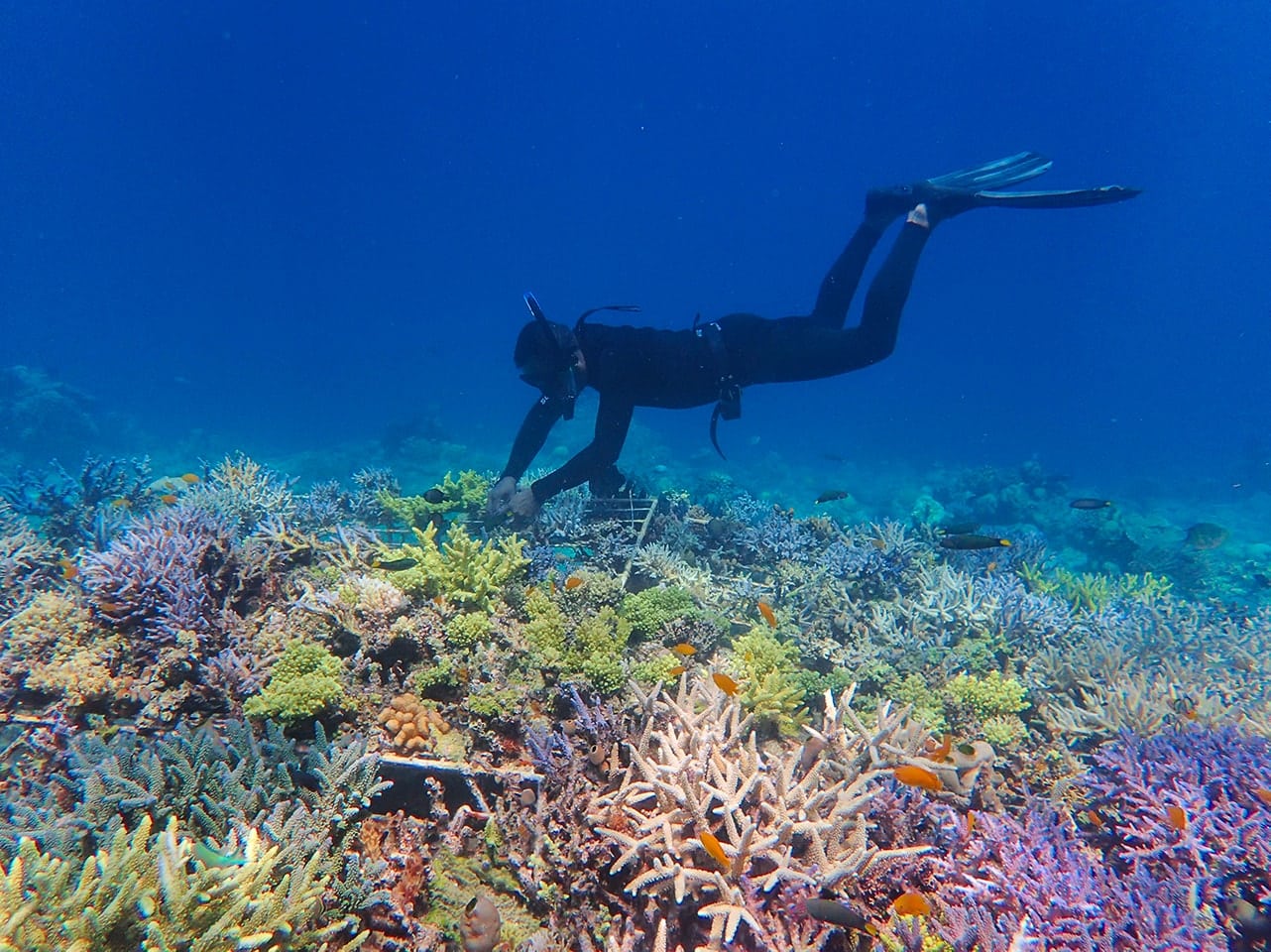 Marine biologists work at the resort in coral grafting and restoration activities. This involves working with volunteering guests from the hotel to plant coral fragments within a metal mesh embedded on the seafloor.